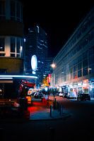 Een avondfoto midden in het centrum van Rotterdam. De foto laat een doorkijk zien vanaf de Meent naar het Rodezand met verschillende kleuren verlichting.