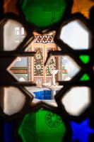 Dit is een foto die ik genomen heb vanachter een deur met glas-in-lood ramen in het Tabbal gebouw in Sursock Street in Beiroet, Libanon. Je ziet een kleine fontein die uitkijkt op een balkon met uitzicht op de stad. Het Tabbal gebouw is door de explosie op 4 augustus 2020 in de haven van de stad beschadigd geraakt.