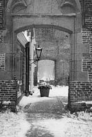 De Ruïnekerk in de sneeuw met een doorkijkje van noord naar zuid.