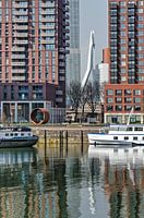 Rotterdams iconische Erasmusbrug is vaak gefotografeerd. Op deze foto speelt "De Zwaan" een bescheiden rolletje. We zien 'm tussen twee van de nieuwe woongebouwen door die de laatste jaren zijn verrezen op de Pols van Katendrecht.