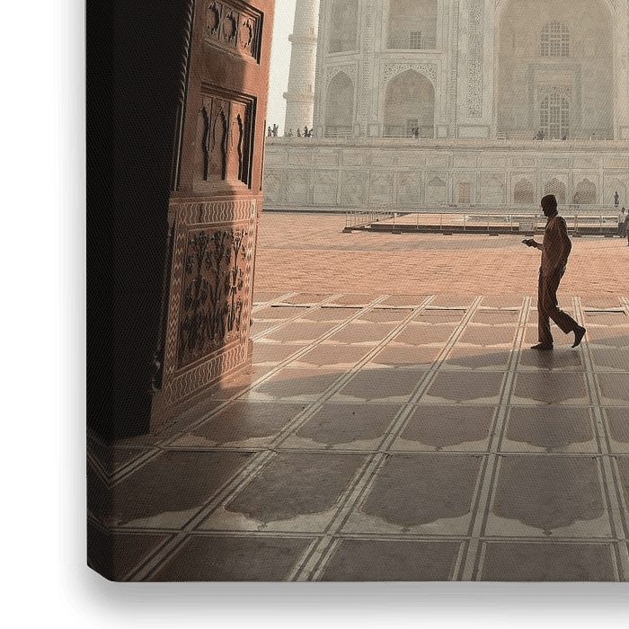 Naast de Taj Mahal staan twee dezelfde rode gebouwen. Eén er van is een moskee. Vanuit die hoek is de foto gemaakt, terwijl de schoonmaker heen en weer liep.