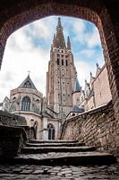 De Onze Lieve Vrouwekerk in het historisch centrum van Brugge, gezien vanaf het doorkijkje bij het fotogenieke Bonifaciusbruggetje.
