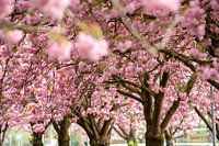 Boomgaard met bruine takken vol met roze bloeiende kersenbloesem. Romantische en sfeervolle lentescène met prachtige bloemen en romantische bloemen. Voorjaar scene in een prunus boom