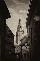 Doorkijkje naar de Stevenskerk Nijmegen in zwart-wit. Links op de voorgrond de Sint Jacobskapel. Midden onder het Glashuistheater. Centraal de Stevenskerk.