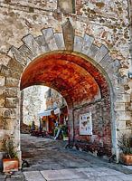 Een blik door een stenen boog in Panicale in Umbrië, Italië. Ons oog volgt de weg onder de boog door naar de bar op het plein daarachter. En het is kersttijd, dus de bar heeft zijn eigen kleine kerstboom voor de mensen die buiten aan de tafel en stoelen zitten te genieten.