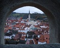 Doorkijkje naar de stad Cesky Krumlov in Tsjechië, genomen vanuit het kasteel op de heuvel.