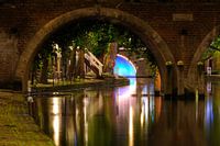 Doorkijkje onder de Jacobibrug over de Oudegracht. De brug met het blauwe schijnsel (Trajectum Lumen kunstwerk) is de Viebrug.