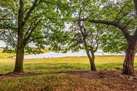 Doorkijkje tussen de bomen door naar één van de vennen in het door Natuurmonumenten beheerde natuurgebied Huis ter Heide in het buitengebied van het Nederlandse dorp De Moer, gemeente Loon op Zand, provincie Noord-Brabant.