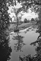 Een doorkijkje door de bomen. Het geheel doet wat fragiel aan. Door de foto in zwartwit om te zetten lijken de blaadjes van de bomen wel van kant.
