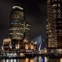 Tussen hotel New York van de Holland Amerika Lijn en de wolkenkrabbers op de Kop van Zuid in Rotterdam door zie je de Erasmusbrug.