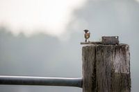 Deze Roodborsttapuit is compleet doorweekt door een hevige lente regenbui. Klein maar fier staat hij op een paal, alsof het allemaal niet is.