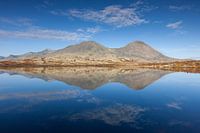 De berg Stygghoin weerspiegeld in het meer, Døråldalen, Rondane Nationaal Park, Oppland, Noorwegen