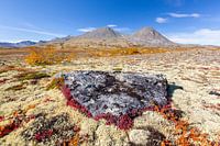 Uitzicht op de berg Stygghoin in de herfst, Doraldalen, Rondane Nationaal Park, Oppland, Noorwegen