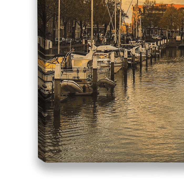 Koop de foto Dordtse Nieuwe Haven in de herfst bij zonsondergang van Lizanne van Spanje op canvas, aluminium dibond, (ingelijste) fotoprint, behang en ArtFrame, op maat geprint in Fine-Art kwaliteit.