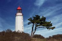 De vuurtoren Dornbusch op het Oostzee-eiland Hiddensee met opvallende dennen.