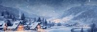 Dorp in Winterslaap - Een schilderachtig winterlandschap dat een knus dorpje afbeeldt, ondergedompeld in sneeuw, met huizen die warm licht uitstralen. De bergen op de achtergrond en de vallende sneeuwvlokken versterken het gevoel van een serene, koude winternacht. De stijl lijkt een digitale aquarel met een focus op blauwe, grijze en warme oranje verlichting.