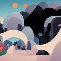 Dit abstracte schilderij toont illustratieve bergen in pastelkleuren en zwart die bolvormig lijken te zijn weergegeven. Het geheel doet denken aan een dorp in de bergen, maar dan in een abstracte weergave. De pastelkleuren geven het schilderij een zachte en dromerige uitstraling, wat versterkt wordt door de bolvormige vormgeving van de bergen. Dit schilderij roept een gevoel van rust en kalmte op en nodigt uit tot een contemplatieve blik op de wereld.