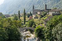 De foto geeft een prachtig beeld van een dorp in het landschap van Ticino, het Italiaans sprekende gebied in het zuiden van Zwitserland. Het dorp ligt in een vallei, met op de achtergrond meren met palmbomen en scherpe Alpentoppen. De foto toont het dorp op de voorgrond, met zijn huizen met rode daken en smalle straatjes die door het landschap kronkelen. Het dorp is omgeven door weelderige groene bossen en velden. Het beeld toont de schoonheid en diversiteit van de regio Ticino, met zijn mix van mediterrane en alpiene invloeden. Het is een vredig en idyllisch tafereel, dat de kijker uitnodigt om de schoonheid en charme van het dorp en zijn omgeving te verkennen.