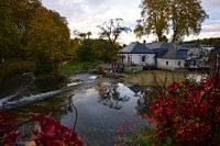 Dorp op het Franse platteland met rode bloemen op de voorgrond. De bomen en herfstkleuren reflecteren in het water van de rivier.
