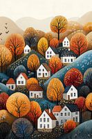 Een betoverend herfsttafereel waarin witte huisjes verspreid liggen over glooiende heuvels, omringd door bomen in warme oranje, gele en rode tinten. De illustratie ademt een sprookjesachtige sfeer uit met zijn gestileerde vormen, decoratieve patronen en een harmonieuze compositie van kleuren die de magie van de herfst vangen in een denkbeeldig landschap.