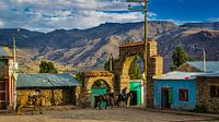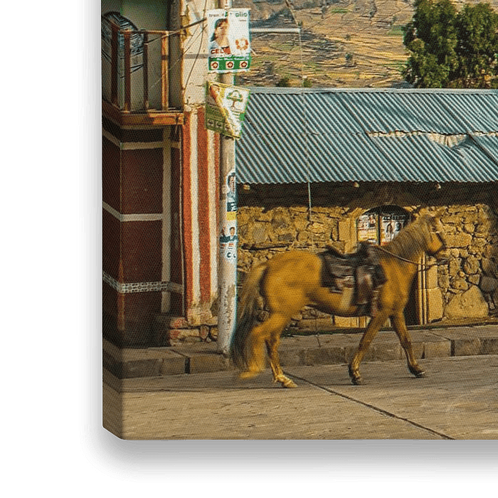 Dorpsplein van Coporaque met paarden in de avondzon, Peru. Uitvalsbasis voor tochten naar de Colca Canyon. Colca kloof. Mooi sfeerplaatje. Terug in de tijd.