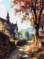 Dit beeld vangt de essentie van de herfst in een rustig dorp. De met waterplassen omzoomde straat weerspiegelt het gouden licht van de herfst en leidt ons naar het hart van het dorp. De vakwerkhuizen met hun historische gevels stralen een constante warmte uit, terwijl de vallende bladeren een tapijt van kleur vormen. De combinatie van gedetailleerd schilderwerk en kundige belichting creëert een sfeer die zowel rustgevend als diepgaand is. Het contrast tussen de droge oppervlakken van de straat en de plassen vangt de essentie van een herfstdag na de regen. Het palet van aardetinten en de zorgvuldige modellering van de architectuur suggereren duurzaamheid en een zekere tijdloosheid. Het kunstwerk gebruikt een doordachte compositie om het oog zachtjes door de scène te leiden en het gevoel van een vredige dorpswandeling over te brengen.