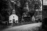 Een sfeervol zwart-wit beeld van een rustig dorp, waar kasseien, bomen en een kleine kapel samen een tijdloos geheel vormen. De compositie ademt eenvoud, historie en rust. Een karaktervolle kunstprint die perfect past in een klassiek, landelijk of minimalistisch interieur en uitnodigt tot vertraging en bezinning