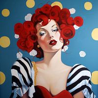 Kleurrijke illustratie in retro pin-up stijl met een blauwe achtergrond en geel en witte stippen.