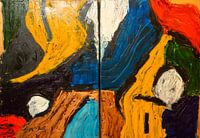 Een tweetal schilderijen, formaat 50x70 cm, waar dikke acrylverf in felle kleuren is aangebracht op het canvas. Het tweeluik is ook horizontaal te koppelen.