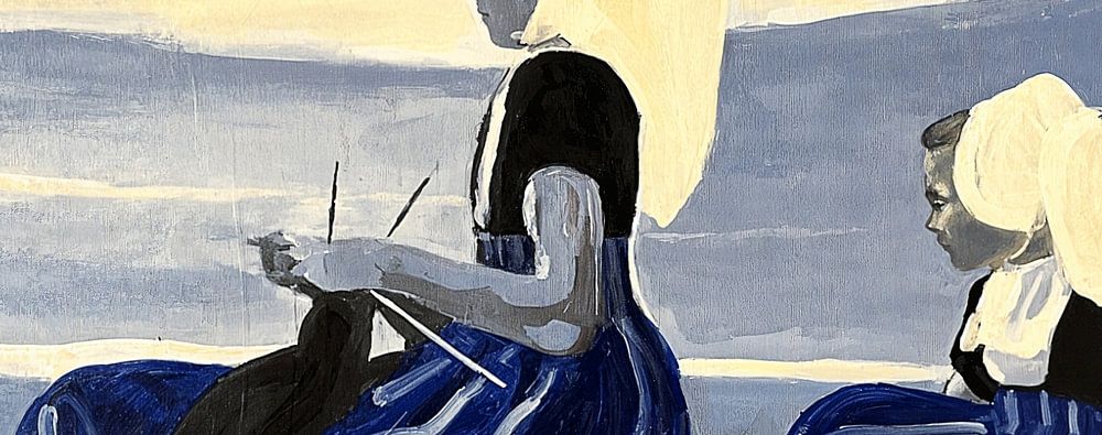 Moderne weergave van twee Zeeuwse meisjes zittend in de duinen. Het originele werk is gemaakt met acryl en olieverf op doek, geïnspireerd door archieffotografie.