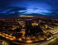 De rabobank in Utrecht stad tijdens een mooie zonsondergang. Mooie blauwe lucht en veel lichten vanuit de gebouwen.