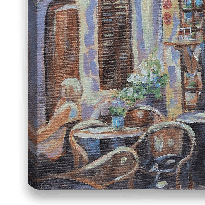 Een terras in Tourtour Frankrijk. Op reis door Frankrijk zag ik de mooie schaduwen en de mooie kleuren die mij inspireerden tot het schilderen van dit schilderij.