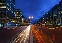 De Schipholweg in Leiden gezien vanaf het stationsplein. Het verkeer raast de tunnel in en uit op een koude drukke winter ochtend.