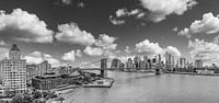 Downtown Manhattan met de Brooklyn bridge op een zonnige dag in New York zwart wit