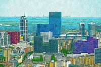 We zien hier een bonte verzameling architectuurstijlen uit verschillende naoorlogse tijdperken. Op de voorgrond het gebied rond de witte de Withstraat en de Schiedamsedijk met vooral veel gebouwen uit de jaren vijftig en zestig. Verder op de achtergrond het gebouw met de N en andere hoogbouw rond het Weena, merendeels gebouwd in de jaren tachtig en negentig. Links het rood-witte Calypsoblok en in het midden de U-vormige Karel Doorman, twee recente toevoegingen aan de binnenstad.