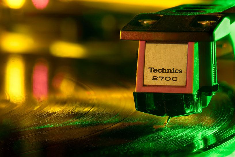 Oude draaitafel uit 70er jaren van Technics met grammofoonplaat in groen en geel licht
