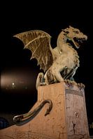 Draak op de drakenbrug in centrum Lubliana, Slovenie, laat in de avond