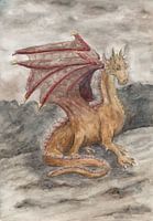 Deze aquarel toont een draak zittend op een stenig berglandschap.