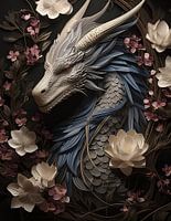 Fantasierijke afbeelding van een draak tegen een zwarte achtergrond. Omringd door prachtige bloemen, artistiek ontworpen met behulp van kunstmatige intelligentie.