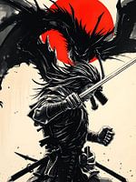 Een felle samoeraikrijger staat klaar met zijn zwaard tegenover een machtige draak in een dramatische fantasiescène. De spanning tussen krijger en beest weerspiegelt kracht, eer en oude mythen.
