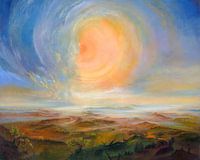Dit schilderij baadt in warme kleuren en creëert een bijna magische sfeer. De hemel opent zich in een sierlijke beweging en onthult een achtergrond van levendige sinaasappels en roden verlicht door een zachte, dieprode zon. De open hemel is in rustgevend blauw, paars en zacht oker. De scène wordt overspoeld met een zomers licht dat…