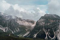 Dit prachtige berglandschap vangt de dramatiek en sereniteit van de Seceda-bergkam in de Dolomieten van Italië. De imposante pieken, met hun ruige rotsformaties en subtiele sneeuwsporen, worden omlijst door een spel van zachte wolken die het tafereel een etherische kwaliteit geven. De groene valleien onder de machtige bergen voegen een vleugje rust toe aan dit dynamische uitzicht.
