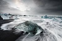 Op de dag dat deze foto werd genomen, was het stormachtig weer op het zwarte lavazandstrand voor de lagune van de gletsjer Jökulsárlón. Deze foto is bedoeld om dit drama over te brengen op de kijker.