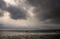 Een drooggevallen zeilschip ligt in de Waddenzee voor de kust van het Nederlandse eiland Terschelling. Het is eb, aan de horizon loopt een groepje wadlopers. Buien en zon wisselen elkaar af, wat resulteert in spectaculaire wolkenluchten.