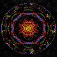 Een interessante caleidoscoopafbeelding, met een symmetrisch patroon dat uitstraalt vanuit het midden. In het midden van de afbeelding zien we een stervormig ontwerp en vervolgens cirkels van kleuren die naar buiten toe uitstralen naar de rand. De heldere kleuren, waaronder rood, blauw en groen, steken opvallend af tegen de zwarte achtergrond, vandaar de naam Dramatic Kaleidoscope.