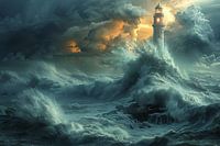 Dramatische scène van een vuurtoren omringd door woeste golven en donkere, stormachtige wolken bij zonsondergang.