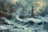 Een hyperrealistische afbeelding van de ruige schoonheid van een vuurtoren omringd door wilde golven en steile kliffen.