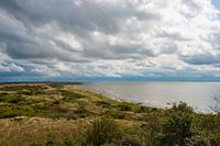 Dramatische wolken boven Het Oerd op Ameland; foto genomen in wandelgebied bij Oerdhut, aan de kant van de Waddenzee; genieten van de stilte en de natuur. Je voelt de dreiging van de zware wolken. Waddeneiland van Nederland.