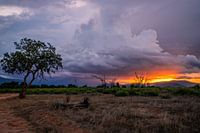 Uiteindelijk ben ik erin geslaagd precies deze unieke sfeer van wilde dieren vast te leggen. Hier ziet u een landschapsfoto bij zonsondergang van Tsavo East National Park.