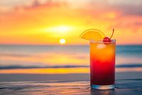 Een verleidelijke cocktail, gelaagd in heldere kleuren, harmonieert perfect met de gouden zonsondergang boven de kalme zee. Het verse fruit en het glanzende oppervlak van het glas geven het moment een tropisch tintje. Dit beeld is een ideale blikvanger voor elke keuken of een uitnodigende woonkamer, die een ontspannen vakantiestemming verspreidt.